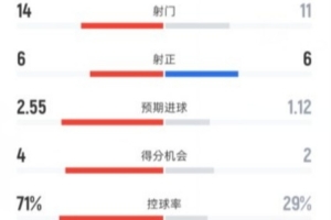 切尔西3-2西汉姆联全场数据:射门14-11,射正6-6,控球率71%-29%